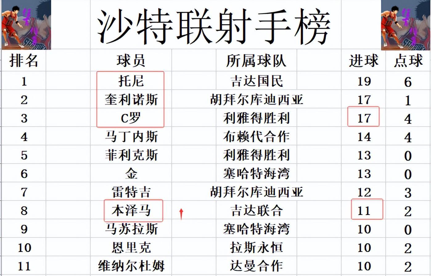 射手榜方面,托尼今天打入一球,19球继续领跑,C罗和奎利诺斯17球紧随其后并列第2。马丁内斯14球排第4,菲利克斯和金13球并列第5.本泽马今天3射1传,11球一举冲入前十。